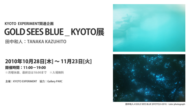 淡い青の光を放つかのような写真作品を制作する写真家・田中和人。 この実風景とは思えない作品は、写真としてあるはずのドキュメンタリー性を解放し、イメージを抽象化します。 まるで絵画のような作品に、私たちはこれまで目の前の風景に抱くことのなかった想像的有余を静かに感じることでしょう。 本展では、KYOTO EXPERIMENTの開催に寄せて制作された新作「GOLD SEES BLUE(KYOTO)」シリーズを中心に田中和人の新作・近作展を開催します。 京都の「ある場所」をモチーフに制作された本シリーズには、古都と呼ばれる京都に内在する都市のまだ見ぬ可能性が秘められています。