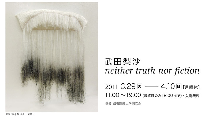 この度は、美術作家・武田梨沙による「neither truth nor fiction」展を開催いたします。 2010年に成安造形大学・テキスタイルアートクラスを卒業、現在は同大学にテキスタイルアートクラス研究生として在籍する武田梨沙(たけだ・りさ 1987〜)は、これまでおもに「織り」による作品を制作しています。