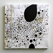 それは絵画において、モノが存在する場としての下絵と、その場に存在するモノとしての盛り上がった無数の絵具の小さな固まり。それらが規則をもって画面に広がり、モノと場、その間にある関係性を描き出す。