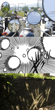 また、作品【2】《B&B_13》は、バイクのミラーや木漏れ日の写真の中に、マンガの一コマを構成するそれぞれの要素を見ることができ、そこに現実と非現実が綯い交ぜとなった状態(世界)をつくり出しています。