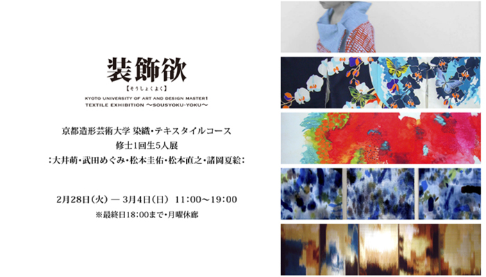 本展覧会は京都造形芸術大学の染織・テキスタイルコース修士1回に在籍する、大井萌・武田めぐみ・松本圭佑・松本直之・諸岡夏絵の5名によるグループ展です。鮮やかに染めあげられた着物や、美しさに機能性をあわせ持たせる衣服、「糸」や「織り」という染織の素材・行程に向き合ったタペストリーなど、それぞれの作品には「染織・テキスタイル」の持つ表現の幅を見て取ることができます。