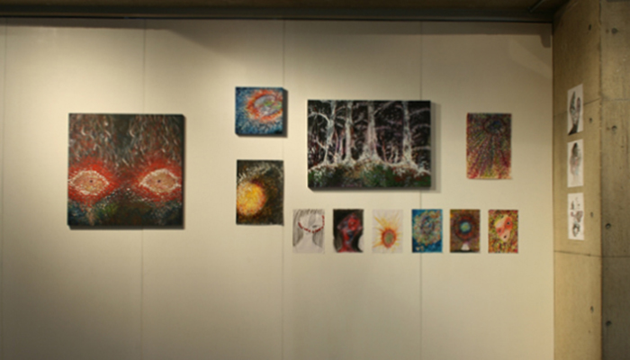 『日々の問題に向き合った時に、自分に必要な力を身につける為に、描かざるをえない』と語るとおり、その絵はまず、「生きることの一部」として、極めて私的な「自身との対話」として「描かざるをえなかった」ものであり、他者に伝えることを目的としないその絵は、都度の感情や衝動さえもありのままに描きつけられた、まるでコトバになる前の「音」による対話の痕跡であるかのように思えます。しかし、その対話を重ねる中で、次第に『何かに描かされている感覚』がわき上がり、絵は外に向かって開かれたものとして描きあげられると言います。