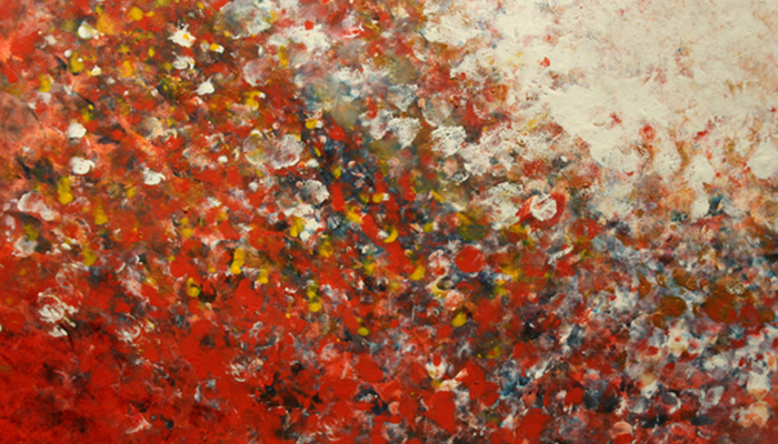 その絵には、それまでの絵筆や線によるイラストレーション的な作画は無く、絵具を指で叩き付け、擦り付けたかのようなタッチや、色彩が画面上で大胆に混色されている様子、中央に大きく浮かび上がる抽象的で不確かなカタチ(おもに「まる」)などは、まるで絵具を手にした子どもの遊びの中から生まれたような絵に見えます。また、具体的なモチーフやタイトルなども明らかでは無いその絵は、何か特定のイメージを再現するためや、メッセージを伝達するために描かれたものではないと分かります。
