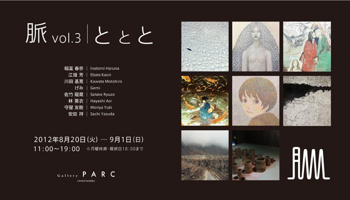 ギャラリー・パルクでは、2013年8月20日[火]から9月1日[日]まで、「 脈展 Vol.3 ととと 」を開催いたします。 本展は一昨年より毎夏に開催している「脈展」の第三回展であり、京都造形芸術大学の卒業生有志8名の自主企画によるグループ展です。