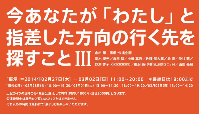 ギャラリー・パルクでは、2014年2月27日[木]から3月2日[日]まで、倉田翠 展示・公演企画『今あなたが「わたし」と指差した方向の行く先を探すことIII』を 開催いたします。