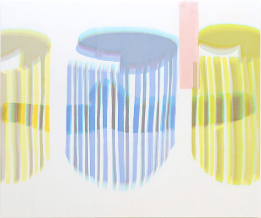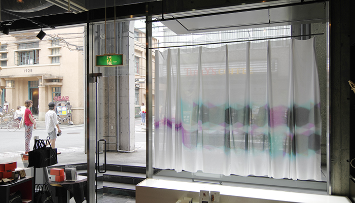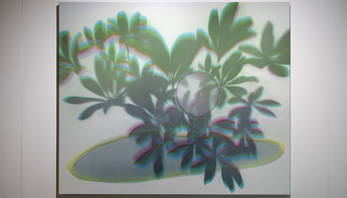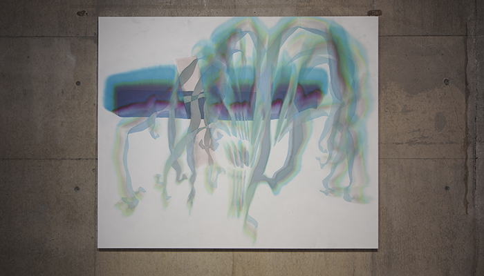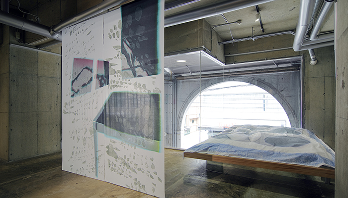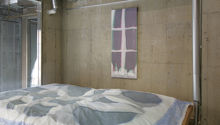 また、それらは「布」としてコートフックに掛けられたり、カーテンとして吊られたりと、作品はあたかも「風景の一部」として空間に存在します。この「布のある風景」は、作品(絵画)にどこまで物としての存在感を与えることができるかという試みでもあり、作品に「背景」をつくり出すことで、「世界の一部を切り取ったもの=絵画」としての構造を作品として提示する試みでもあります。