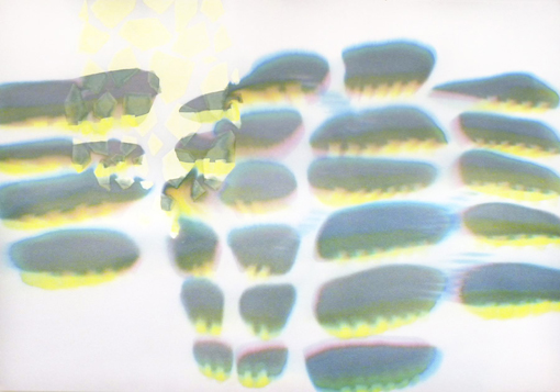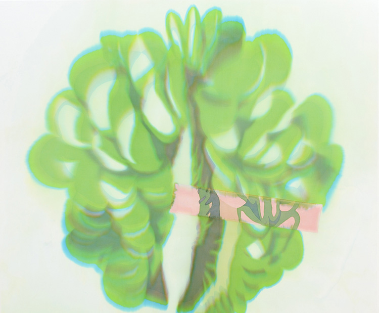 むらたは「目に見える景色は、変化し続ける世界のごく一部の一瞬を切り取ったものにすぎない」として、一旦は布に染めた絵(絵画)を再び水によって滲ませ、そこに現われたカタチを定めない流動的な世界を再び布に写し取ります。そのプロセスは現実の世界を切り取りながら、そこに滲みや揺らぎによる偶然や必然、むらたの夢想や潜在意識すらもが綯い交ぜとなったイメージを描き出すことで、明確なカタチを持たないながらも、どこか・何かに繋がるかのような予感を鑑賞者に覚えさせます。