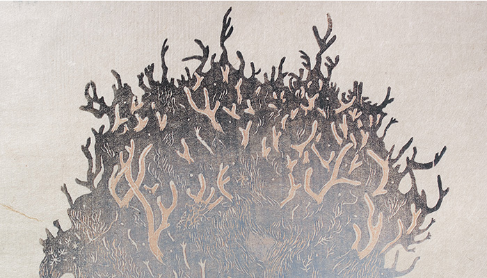 ふるさかはるか(1976~)は、自然素材の観察から生まれる木版画を制作しています。ふるさかは木版画を制作するにあたり、まず版木となる無垢の木の持つカタチやフシ、木目などと関わりながら図案を描いていきます。