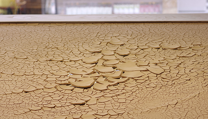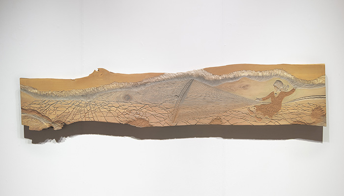 ドゥオッジにみるサーミの美学・哲学に習い、書き留めた言葉を基に、日ごろから収集している土や木を用い、細やかな彫りによる線の集積によるおよそ10点の木版画とともに、その版木、土絵の具のインスタレーション、トナカイの声、ブーツなどを展示します。