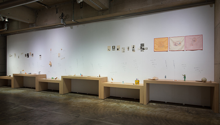 本展、「scene の つくりかた」は、2008年のscene-1にいたるまでと、scene-36からscene-37までの約6年の間を中心に、牛島が制作していた『scene』にまつわるいくつかの習作や試みを展示するものです。「異なる要素」を「繋ぎ合わせる」点に着目して試みられたドローイング作品をはじめ、牛島作品に多く用いられる「布」を要素とした作品や「モノと言葉」により空間にアプローチした作品など、sceneにまつわる作品が、その最新作とともに展示されます。
