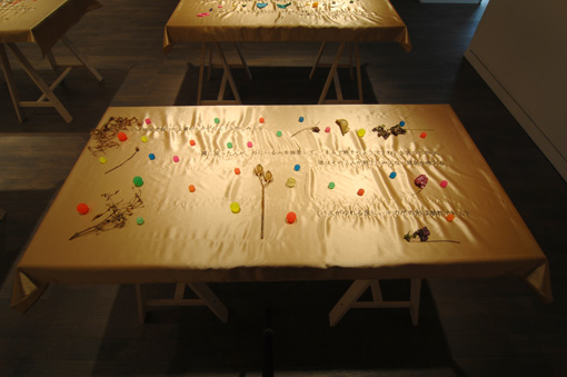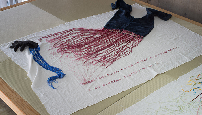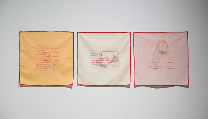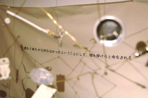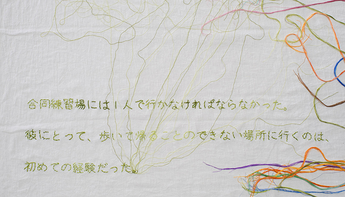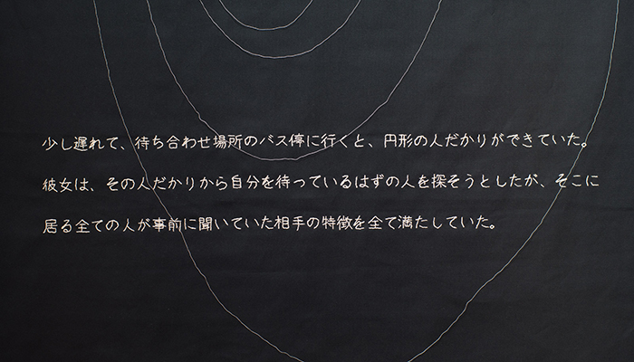 大学在籍中にはおもに石彫作品の制作に取り組んできた牛島は、次第に「モノと文字(言葉)」による作品を展開させ、2003年より『scene』と名付ける一連のシリーズを進めます。牛島は『scene』において、「物語をつくる」という事を強く意識しながらも、意図的な物語の構築は避け、日常のとりとめない場面や出来事などを切り取り・つなげ、そこにシーンのようなものを浮かび上がらせます。『scene』は「モノと言葉」(日常品や拾ったモノと、おもに刺繍による言葉)によって構成され、それらは一見すると「無関係な距離」を保ちながらも、鑑賞者はそれらが「いつか・どこかで交差する」かのような「予感」を覚え、その茫漠とした『scene(風景・光景・情景)』の中に確かに物語を見るのではないでしょうか。