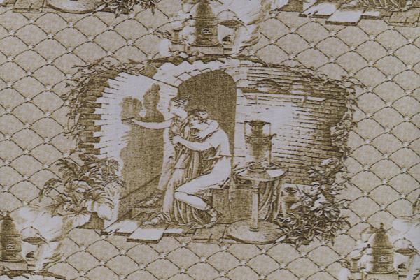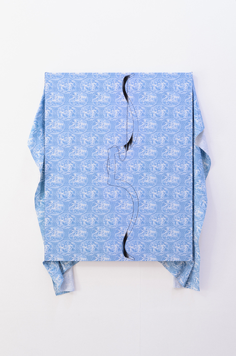 たとえば、染色技法を用いた作品において、描かれる対象は、線を「うつす(写す)」行為を繰り返すことで、時間の経過によるものとは別の僅かなズレやブレをともないます。 またトレースドローイングの《trace the boundary》は、既存の捺染プリントのパ ターンを引用しています。このプリントの図は、〈女性が壁に映る男性の影の輪郭をなぞった〉ということが、絵画の起原とさ れる物語を元にしています。わたしはこの図を、制作に一部を引用しています。なぜなら、図のなかの女性が光を通して壁に映る男性の影の輪郭をなぞる情景と、わたしが染織による制作プロセスの中で、何度もひとの姿の輪郭線をなぞるように描 くことの間に、共通するところがあると思 い、そこに意味ある一致があるのではな いかと思った為です。トレースドローイン グは、この〈光を通して壁に投影された姿の輪郭をなぞる姿〉のプリントモチーフを、わたしの手によって「うつす(写しとる) ことによって、避け難い僅かな像のズレが生じ、対象との間に距離がうまれます。こ うした「うつす」行為によって、「人の関係の間にある距離の曖昧さ」と繋がる表現となると考えています。西山裕希子