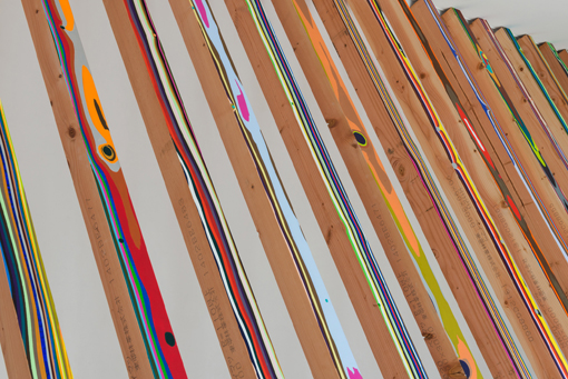 絵筆を持たずに絵画に取り組み、彫刻刀を持たずに彫刻を出現させ、楽器を持たずに音楽を奏でるかのような明楽のアプローチは、一見して色彩によるインスタレーションとして回収される点も多いかもしれませんが、本質的にそれは「絵画」を解釈・分解し、その諸原的要素を抽出し、必然性の中に放つ行為とも呼べるもので、支持体としての空間の特性を観察し、捉えたものを描き出すための行為に他なりません。