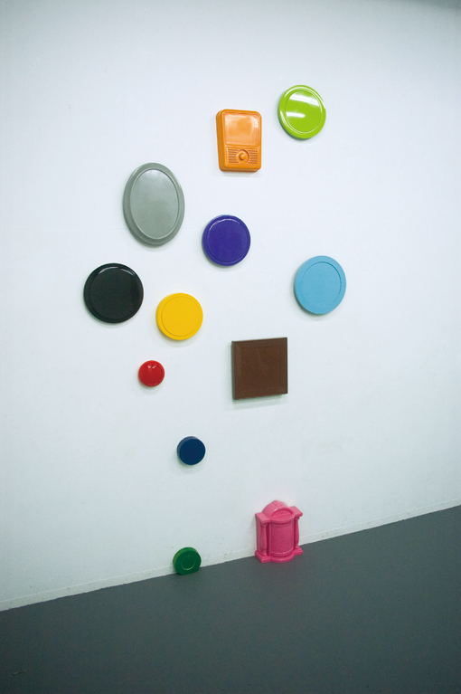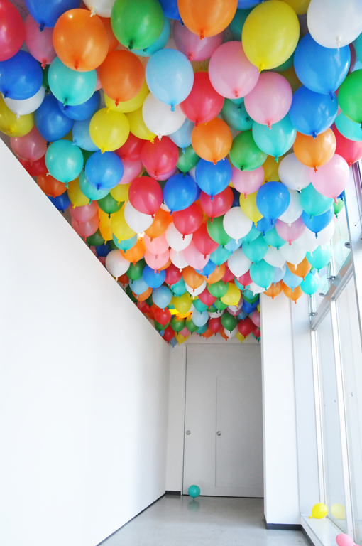 『私は色を置くこと、与えることで作品を成立させています。』とする明楽は、これまで場や物が持つ特性を見極めながら、それらに関わる際に、色彩という要素に着目した作品を多く発表しています。たとえば既製品の時計は彩色され、あからさまに機能を隠されたそれは単なる色彩として壁面に配置されます。色とりどりのスーパーボールは空間に跳ね回ってストロークを描き続け、大量のビー玉は床にドリッピングとして転がり、ランダムに選択された色を木目に沿って与えられた角材は空間に絵画を存在させます。また、いわゆるホワイトキューブギャラリーの天井は浮かびあがるカラフルな風船により満たされる。