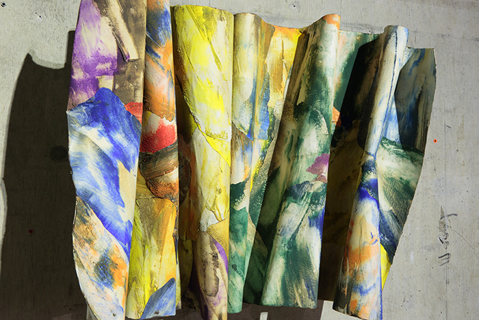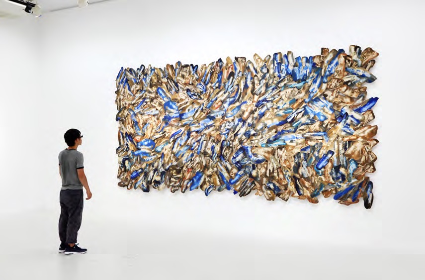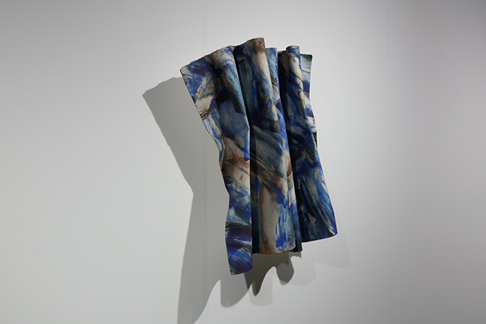絵画に向かう薬師川の思考にはまず「あらゆるものから質量が失われつつあるこの世界」への危機感があるといい、絵画を作家の「表現」とするのではなく、作家が絵画を「通して」思考し、そこに何を「託す」のかという自問を抱いています。作品《絵画碑》では、まず絵画に「時間を託す」として、かつて“ 何か” であったものの集積である「土」によるテンペラ絵具とデカルコマニー技法により、画面上に現在までの“ 歴史” という時間を堆積させ、絵画をまるで「時の碑」とするかのような取り組みを見せています。