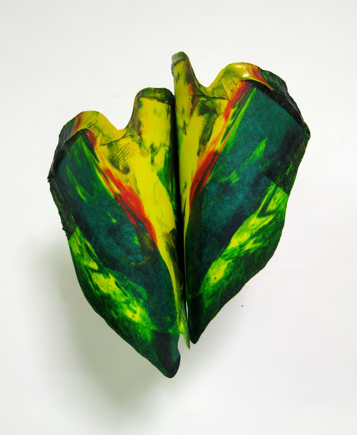 同時に「絵画とは絵具と絵具が引き合い、隣同士の色とが交わる連鎖により成り立っている。この意味において、絵画とは絵具と絵具の引力によって成り立っているといえるのではないだろうか。」とする視点から、「私は、この質量ある物質にそなわる互いに求め合う引力を作品に託す。」と思考を進め、ひとつの絵具の塊をデカルコマニーにより再び分つことで、互いに引き合う微かな「引力」を画面上に生じさせようとしています。