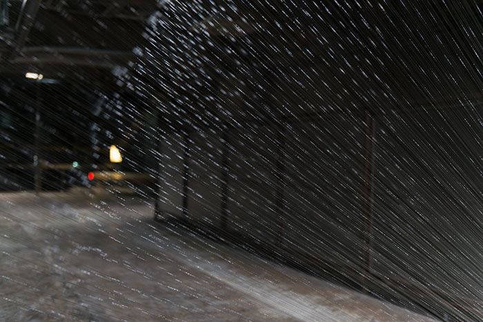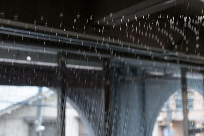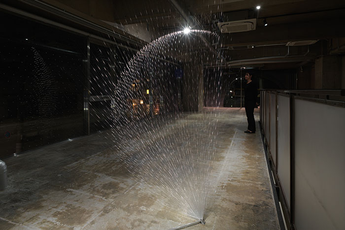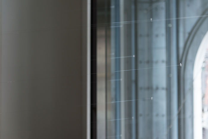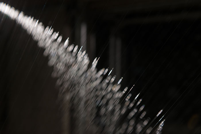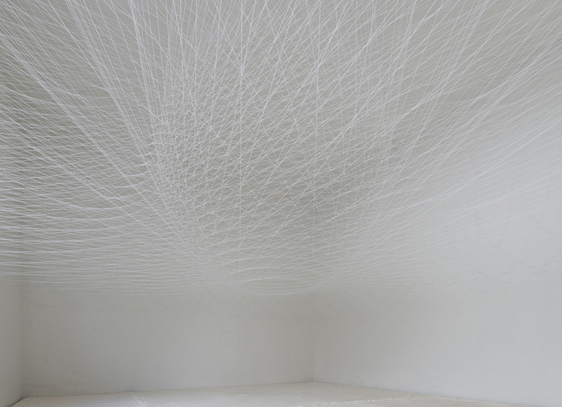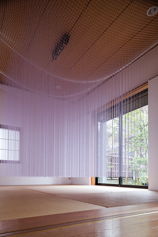 本展は時間帯によって様々な光が射す半面ガラス張りのギャラリー・パルクの空間に、およそ1400本ものテグスを放射状に差し込む大型のインスタレーションです。無数のテグスはあたかも大きなプリズムとして機能し、普段は意識の外に置かれている「空間に溶け込んだ光」の存在や振る舞いを表出させます。そして、これは観賞者の身体を接点あるいは境界として、外(空間)と内(意識)への自覚や、相互に起こる変化と作用への気付きを促す視覚体験となるのではないでしょうか。