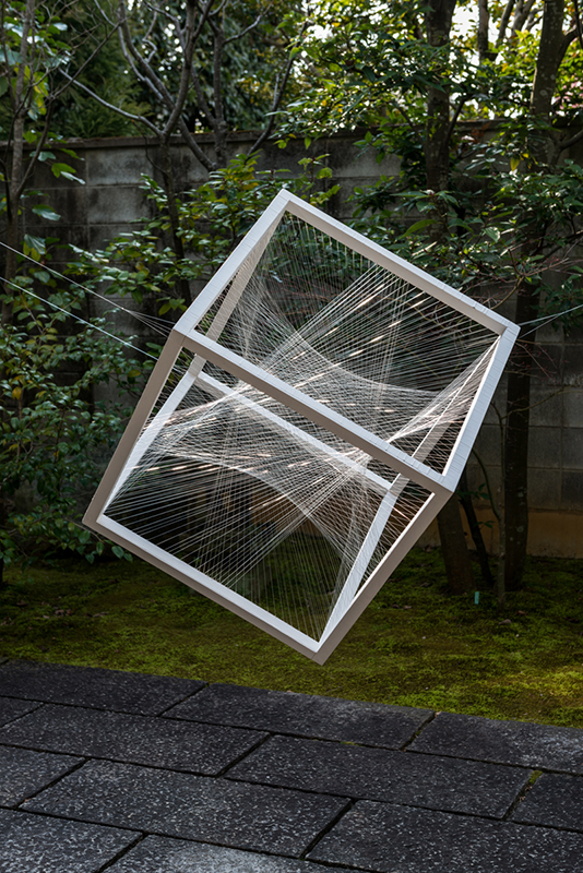 今作ではギャラリー空間に放射状のプリズムとしてテグス糸を差し込み、空間に溶け込んでいる光と観賞者の身体を引き剥がし観察しやすくすることを試みた。