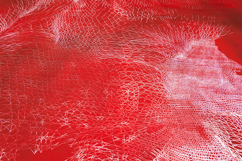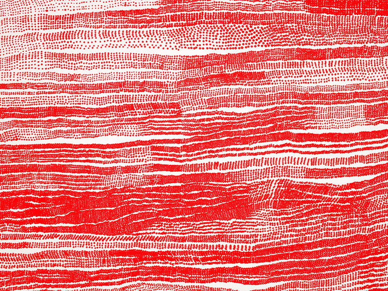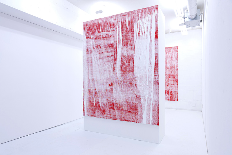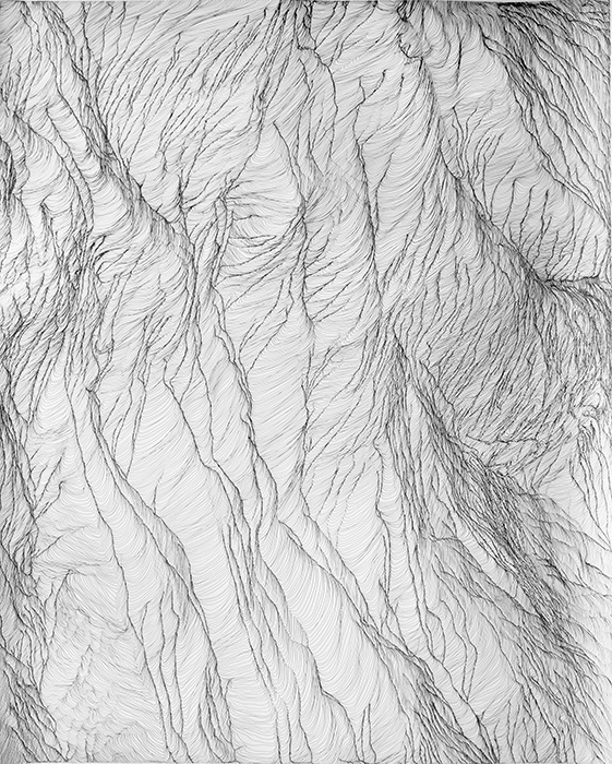 何度も繰り返し、ただひたすらに同じパターンを描き続けることで、物質や身体が時間の流れとともに徐々に変化してゆく過程を理解したいと考えています。制作の過程で点の連続はやがて秩序を失い、線はやがて大きく畝る。やがて浮き上がる一つのイメージは”私”という一人の人間が経た経験の投影で あり、生きるという現象の記録なのかもしれません。