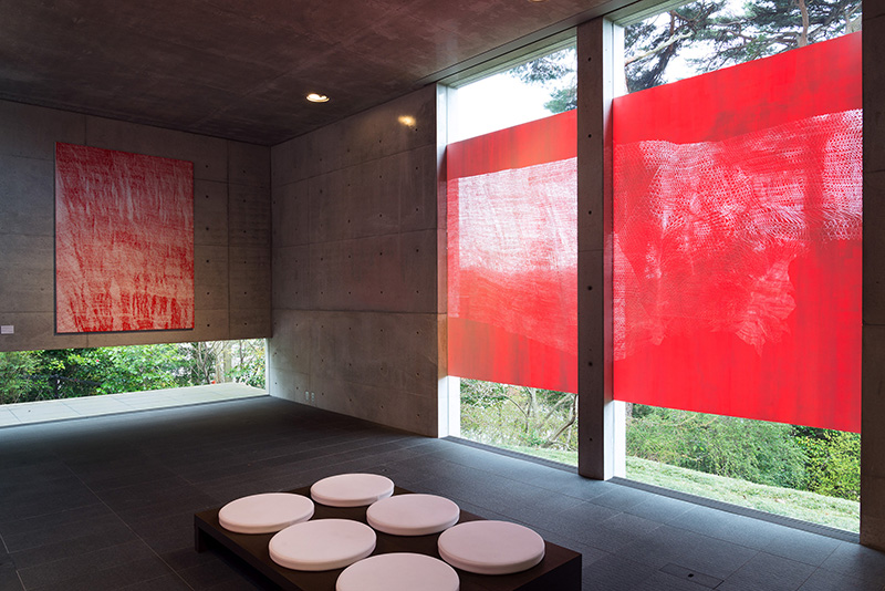 本展では12月末からの会場制作によりギャラリー空間のガラス面を支持体として制作した「点」による作品《 REPETITION RED 》や、「星」による《 REPETITION RED 》のほか、「線」による《 REPETITION BLACK 》を発表します。また、ガラス板に染料インクを垂らして現れる様相を手がかりに描かれた作品《 ORCHIDS 》のシリーズも複数展示いたします。