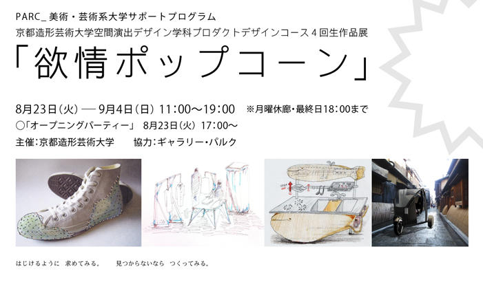 本展「欲情ポップコーン」は、京都造形芸術大学 空間演出デザイン学科 プロダクトデザインコース4回生に在籍する、17名の学生による展覧会です。