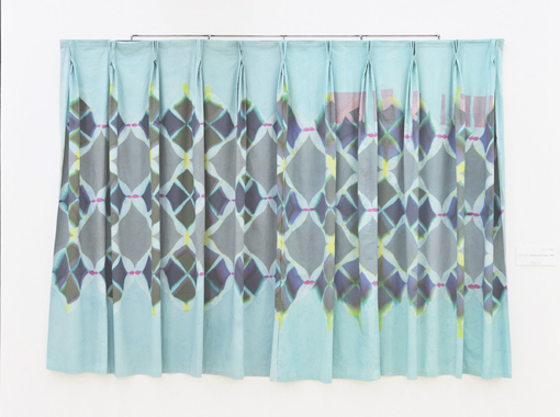 また、それらは「布」としてコートフックに掛けられたり、カーテンとして吊られたりと、作品はあたかも「風景の一部」として空間に存在します。この「布のある風景」は、作品(絵画)にどこまで物としての存在感を与えることができるかという試みでもあり、作品に「背景」をつくり出すことで、「世界の一部を切り取ったもの=絵画」としての構造を作品として提示する試みでもあります。