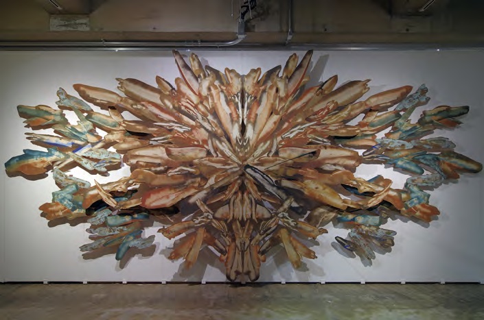 絵画に向かう薬師川の思考にはまず「あらゆるものから質量が失われつつあるこの世界」への危機感があるといい、絵画を作家の「表現」とするのではなく、作家が絵画を「通して」思考し、そこに何を「託す」のかという自問を抱いています。作品《絵画碑》では、まず絵画に「時間を託す」として、かつて“ 何か” であったものの集積である「土」によるテンペラ絵具とデカルコマニー技法により、画面上に現在までの“ 歴史” という時間を堆積させ、絵画をまるで「時の碑」とするかのような取り組みを見せています。