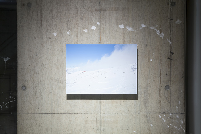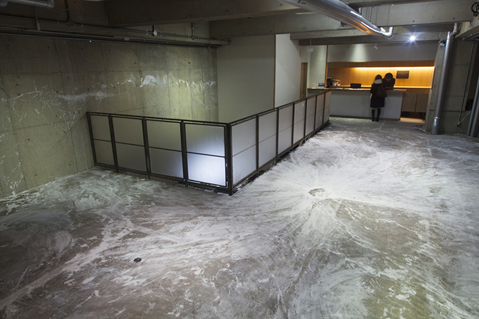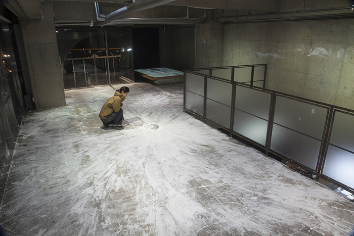 本展では、過去に取り組んできた建物の屋上や床に直接チョークで描く行為をギャラリー空間内でおこないます。床に広がるチョークは鑑賞者が歩くたびに干渉を受け、日々その像を変化させます。また、そうしてかき消され、掠れ、流れた線を受けて来田は会期中にこの絵画を更新し、描かれる山は常に流れ続けることとなります。