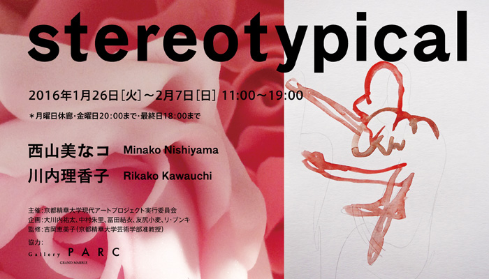 Gallery PARC[グランマーブル ギャラリー・パルク]では、2016年1月26日(火)から2月7日(日)まで、京都精華大学現代アートプロジェクト実行委員会の主催による「stereotypical」展を開催いたします。本展はGallery PARCの会場提供による大学協力展として開催されるもので、京都精華大学「現代アートプロジェクト演習4」(キュレーションの実践を行う授業)の受講生が企画し運営するものです。