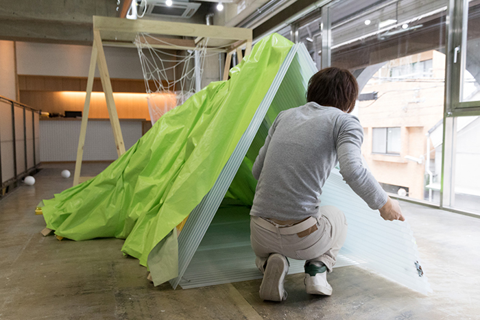 2015年に京都市立芸術大学大学院生美術研究科彫刻専攻を修了した迎 英里子(むかい・えりこ・1990年・兵庫県生まれ)は、「物事の理解に近づく方法を模索しています」として、身の周りにある自然や社会の現象(仕組み)などをシステム(装置)に変換します。そして、それは分かりにくい現象や可視化出来ない事象を簡潔に表すことが目的ではなく、その過程にある「理解へのアプローチ」に主眼があるものといえます。