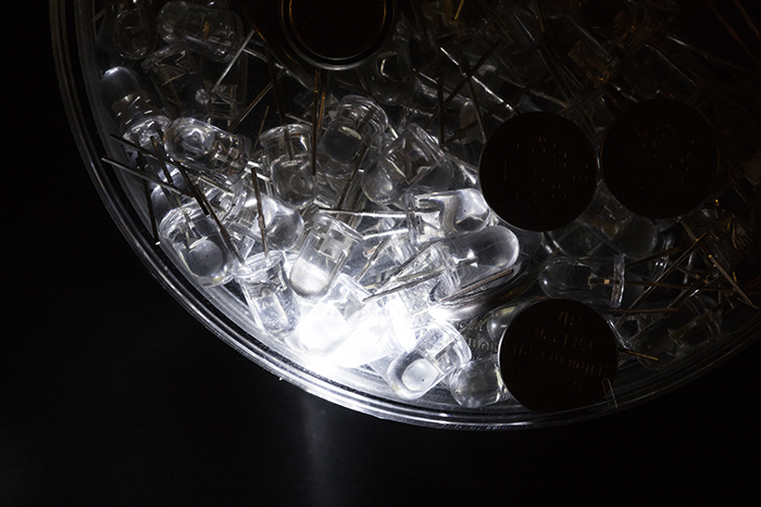 髙須はジャンルや素材・技法を固定しない、様々なアプローチによる作品制作・発表を続けています。 たとえばゴミであったチラシを高級ブランドロゴのカタチに切り抜いて部屋中に貼っていったり、雑誌や絵本においてその対象であるはずのアイドルやキャラクターなどをことごとく塗りつぶしたり。あるいは近年では「宇宙」をテーマとして、シャーレに発光ダイオードとボタン電池を混ぜ入れ、これらを回転させて偶発する光の瞬きを生み出したり、人類が初の月面着陸に用いた靴底を再現した履物をつくり、特別に調合した月の砂の上を歩いたり。