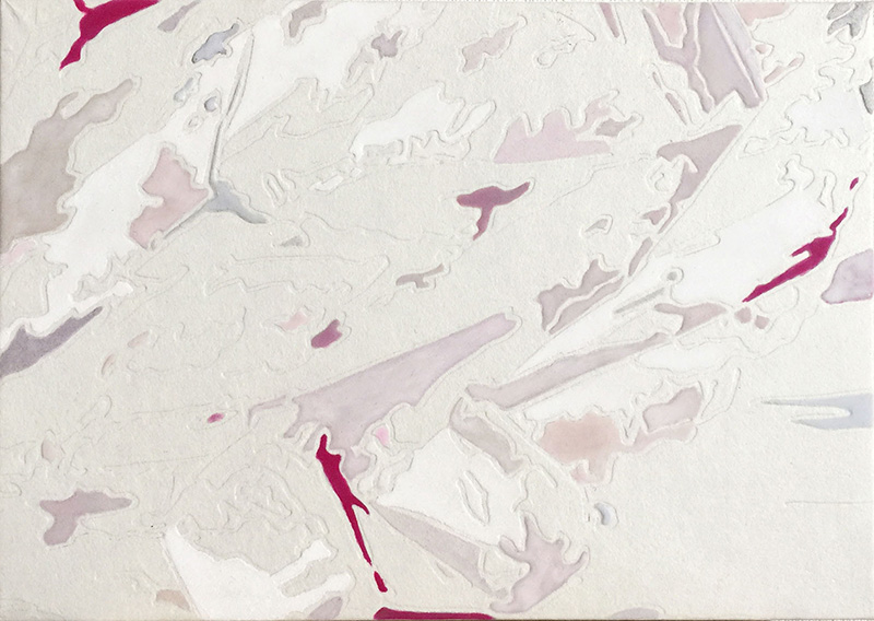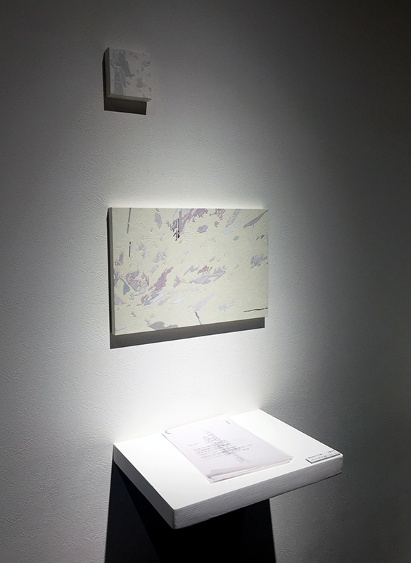 そのために、水晶の写生画をもとにエンボス加工と日本画技法を用い、幾つもの工程を経ながら制作しています。工程ごとに分解と構築を繰り返すことで、私自身の「見出す力」を探求し、新しい視点や新鮮な出会いを獲得しようとする試みです。