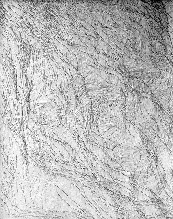 何度も繰り返し、ただひたすらに同じパターンを描き続けることで、物質や身体が時間の流れとともに徐々に変化してゆく過程を理解したいと考えています。制作の過程で点の連続はやがて秩序を失い、線はやがて大きく畝る。やがて浮き上がる一つのイメージは”私”という一人の人間が経た経験の投影で あり、生きるという現象の記録なのかもしれません。