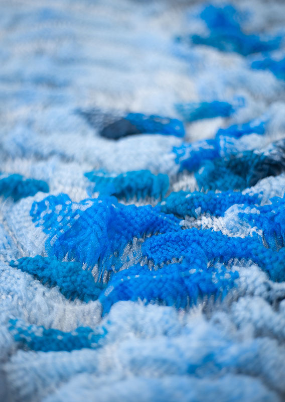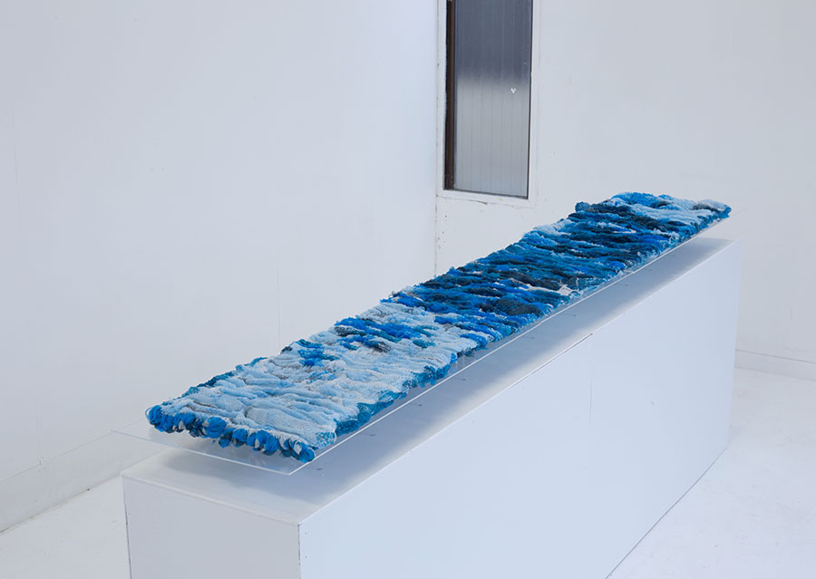 今回は、その感覚世界に「湖」という仮の名を与えて、日々移り変わる「湖」の表情を追いかけ、大きく空間に構成する。言葉では他者と共有することができない感覚を、糸という素材を通して翻訳し、それぞれを空間に配置しひとつの世界を編む。織り、編み、「畝」を生むことで、あいまいな自己をとらえるための旅をする。